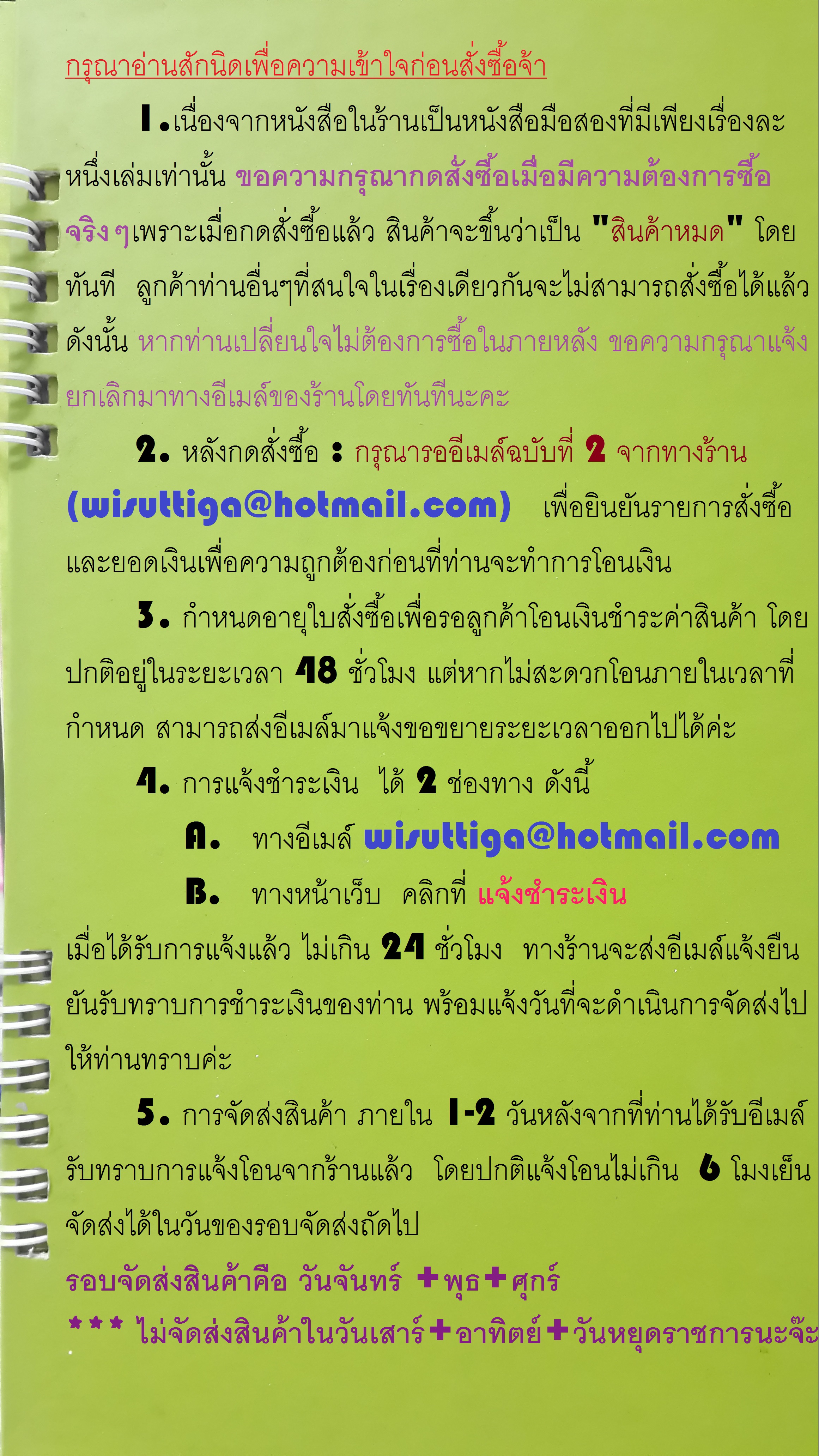กรุณาติดต่อกลับมาทางอีเมล์ของทางร้านด้วยนะคะ : wisuttigabooks@outlook.co.th เนื่องจากพัสดุถูกตีกลับมาที่ร้านค่ะ (ไปรษณีย์แจ้งว่า ไม่มีที่อยู่ตามที่ลูกค้าแจ้งไว้ในออร์เดอร์ จึงส่งกลับคืนมาที่ต้นทาง)